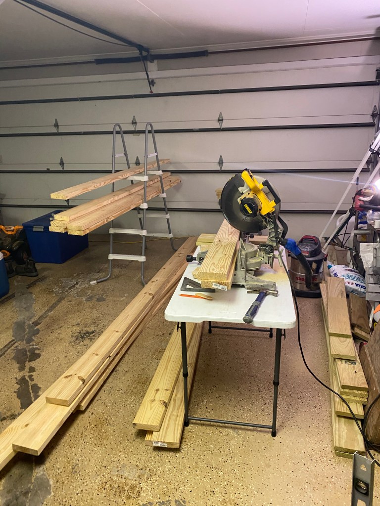 That morning Raymond went to Lowe’s and bought 20 1x4x8s and two 2x8x8s and 12 treated furing strips for the siding seams. He also bought the front door and storm door. Because it was still wet and raining that day he went in the shop and painted all of these with two coats of paint. We used Valspar Exterior paint & primer in the color Possibility 5007-1A
