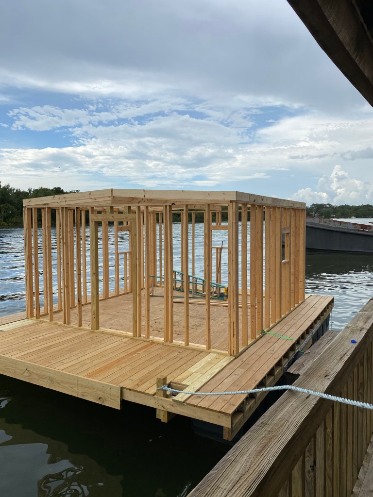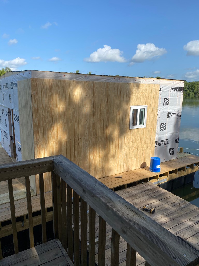 The outside is pretty much complete for now except the awning over the front porch and the gutters down the sides to fill the water tank with rain water. Hopeful the next time he is home we’ll be able to pull wires and plumbing, insulate all the walls and ceiling, frame the bathroom up inside, lay a vapor barrier on the floor and install another 1/2” thick subfloor over the treated 3/4” and install the paneling.