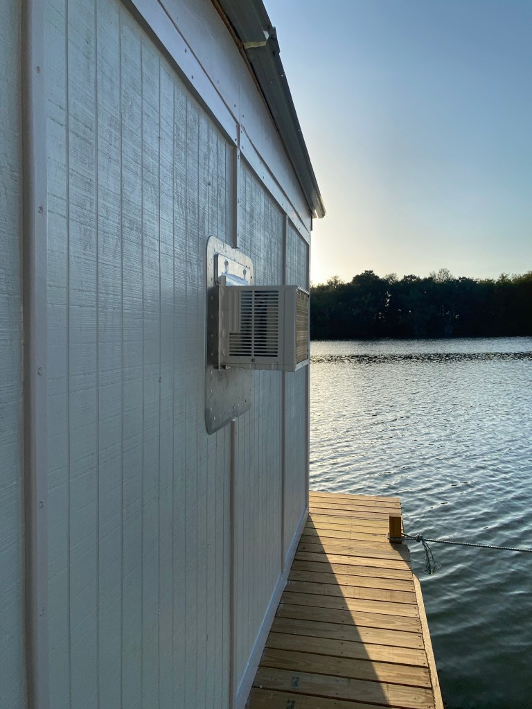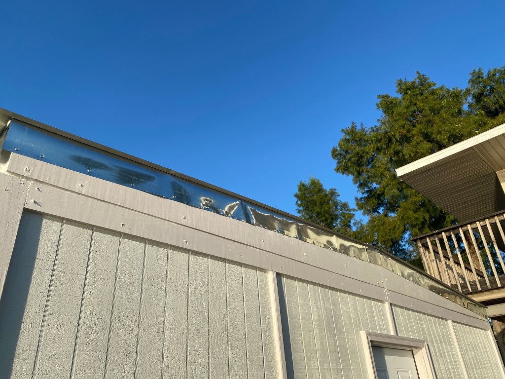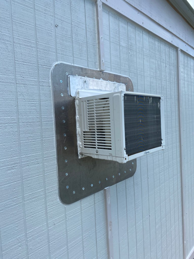 Thursday morning he made a 1/4” thick aluminum plate for the ac hole at the machine shop. Framed the opening for the ac bigger than the actual unit we had just in case we had to go larger in the future we would have the room. Installed the aluminum plate with 40 wood screws and caulked it all then installed the window unit and made sure it had no leaks. Then he had bought 10” flashing rolls long ago so he took and crimped them into a 90 deg flashing and installed that under the metal roofing so there will be no issues with leaks in the future.