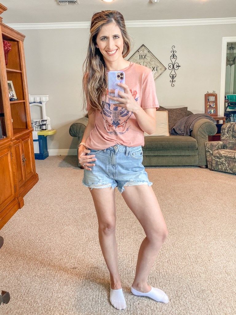 JAKE HIGH RISE CUFFED DENIM SHORTS – $44 – Wearing an Extra Small. Only extra smalls in stock but you can sign up for emails for when the other sizes are back instock.