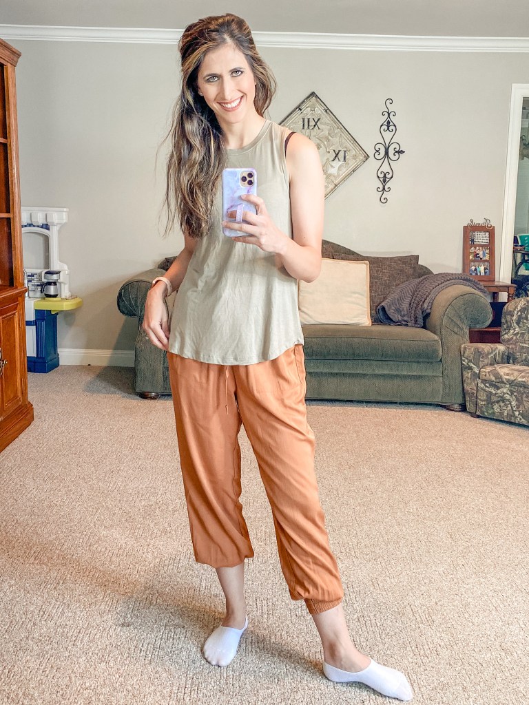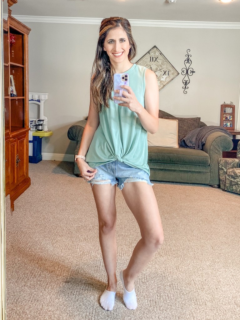 LIKE IT OR LEAVE IT TANK – SMOKE GREEN – $18 — Wearing a Small – Comes in a pink color too – This is the softest top I have even worn. They are both sold out right now but you can sign up for e-mails for when they are restocked.