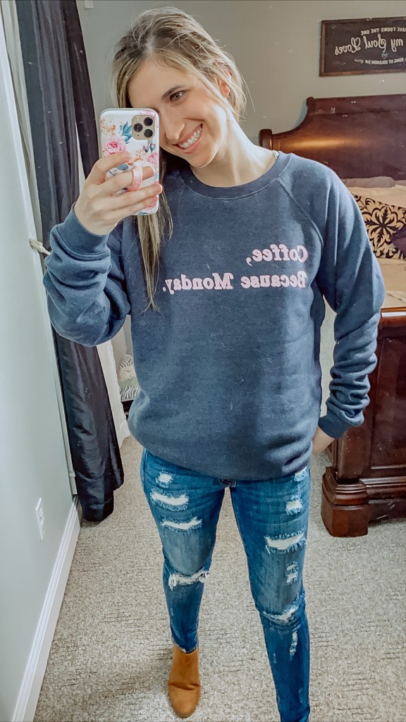 Sweatshirt – COFFEE, BECAUSE MONDAY SWEATSHIRT – Size Small – Final Sale right now – $32.40