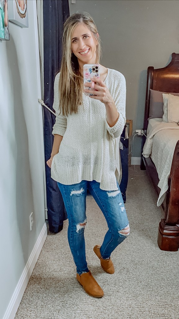 Tops – LAID BACK KNIT SWEATER – Cream & Ginger – SIZE – Small/Medium – Final Sale right now – $32.40 Jeans – UNIVERSAL DISTRESSED FRAYED SKINNY – Size 1 – $54.00 Booties – LOMBARD FAUX SUEDE BOOTIE – TAN – Size 7 – sorry these are no longer available but they are lots of cute booties.